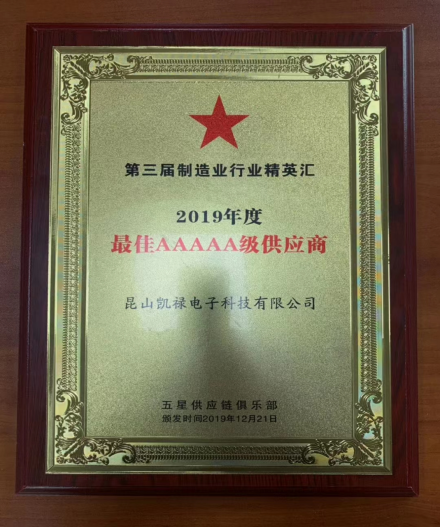 2019年五星供应链俱乐部,第三届制造业行业精英汇年会的序幕拉开了..... 我公司很荣幸成为经过多位采购专家评选出来的《年度最佳5A级供应商》-昆山凯禄电子科技有限公司,在以后的日子里,我们会用更好的品质和服务让公司更上一层楼。